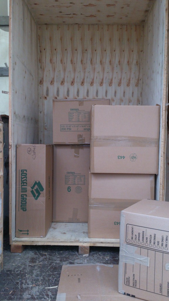 In the end, all of the stuff that we took so much time to gather didn’t look like so much anymore.  A big pile on the pool table and couch ended up fitting in only 6 boxes, and didn’t even make a dent in the wood crate they were sealed in.