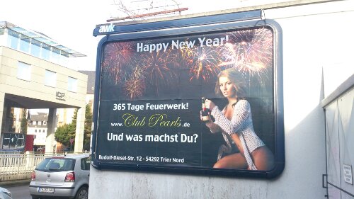These billboards sprang up all over Trier, Germany right before Silvester*. I wonder which would upset some fragile American sensibilities more, the conveniently-but-barely-covered “naughty bits” or the fact that it is an advertisement for a Brothel?