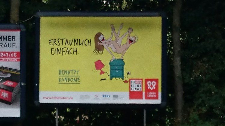 On a serious note, the Liebes Leben (Love Life) campaign is a very in-depth effort by the Bundeszentrale für gesundheitliche Aufklärung (basically: Public Information of the Health Department) to make information about STDs and their prevention as available as possible, and get people to think about it. Once called “Gib AIDS keine chance” (Don’t give AIDS a chance), the printed materials and the website are an expansive source for everything from STD symptom checklist and personal recommendations to condom size chart.